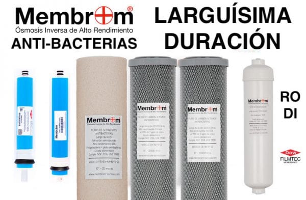 Las membranas que le ofrecemos de FILMTEC™ y MEMBROM® (fabricada con lámina original de FILMTEC™) consiguen una eliminación de contaminantes del 97-99% dependiendo del modelo, siendo capaces de producir agua de baja mineralización con un contenido similar a la de las agua minerales embotelladas. Todo esto con rechazo de agua menor a las membranas standard y con una duración de al menos el doble que las membranas standard (el triple con la prefiltración de este pack).
